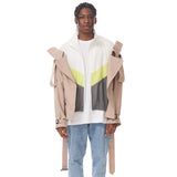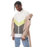 Long sleeve nylon windbreaker in white, yellow and charcoal.