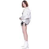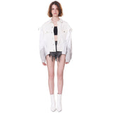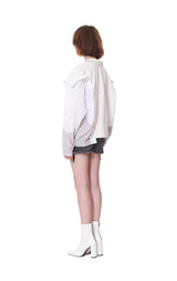 - 正面和背面均為白色牛仔布,兩袖以白色和淺灰色布併合