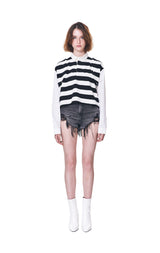 黑白色粗間條橄欖球領長袖襯衫配白色襯衫袖